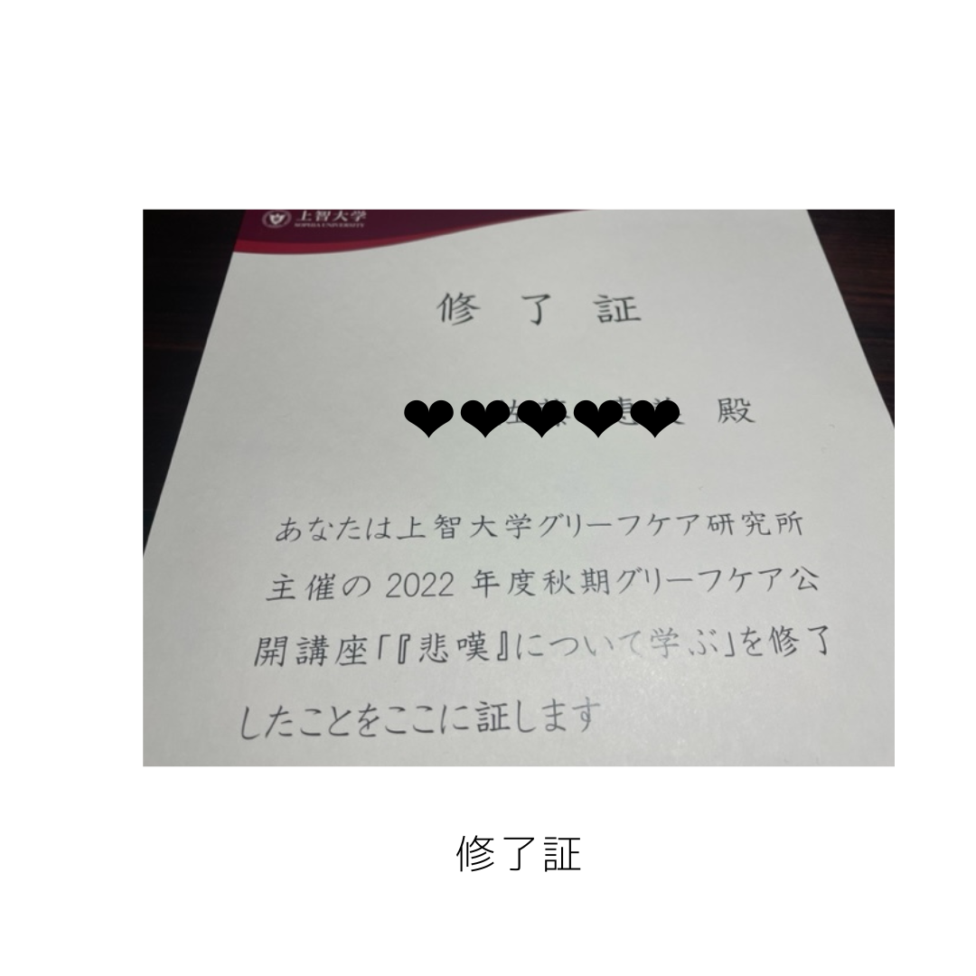 修了証 グリーフケア 2022.12.19 10月から講座を受けまして、その修了書が届きました。 公開講座でこの分野を研究されている先生も知れたしとてもいい時間でした。 何より遠隔ってすごいね。遠くの講座も受けれるんだもの。